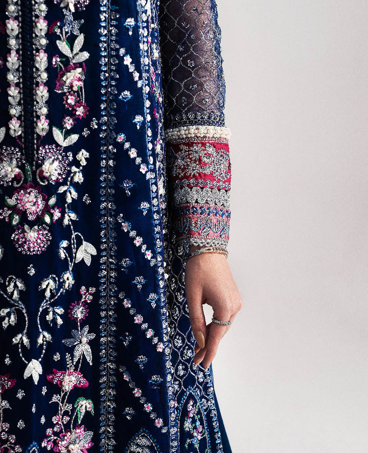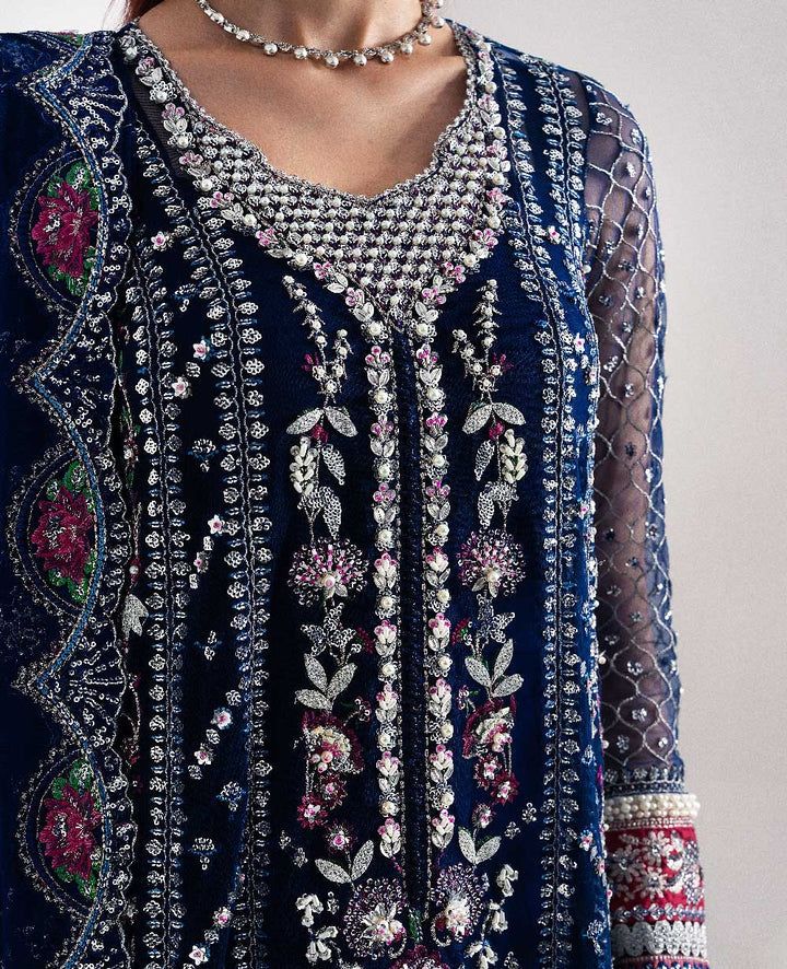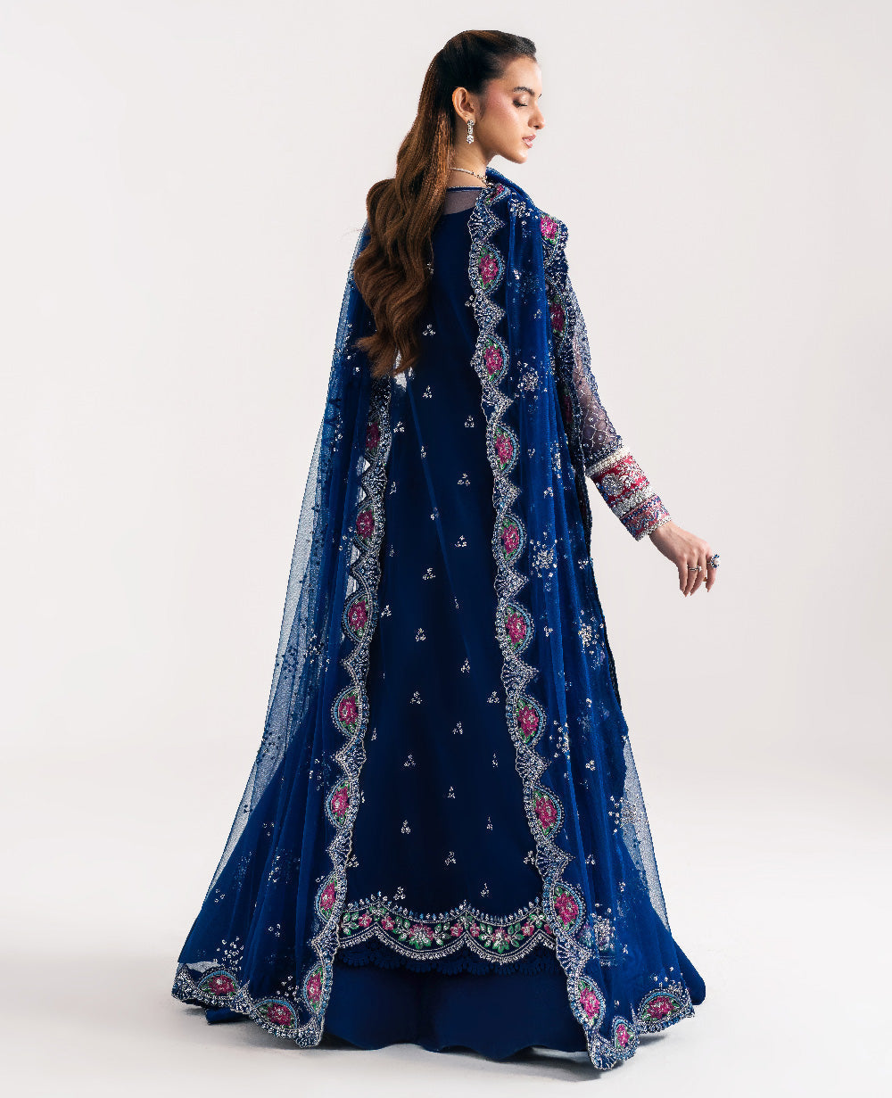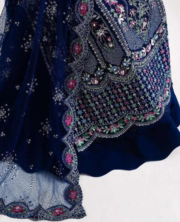 Embrace refined elegance with this stunning blue Republic ensemble. The net shirt is beautifully adorned with multi-colored embroidery and delicate hand work, creating a luxurious and eye-catching look. Paired with a soft net dupatta that adds graceful charm and a raw silk trouser that brings structure and sophistication, this outfit is the perfect blend of modern beauty and timeless craftsmanship — ideal for festive and formal occasions.