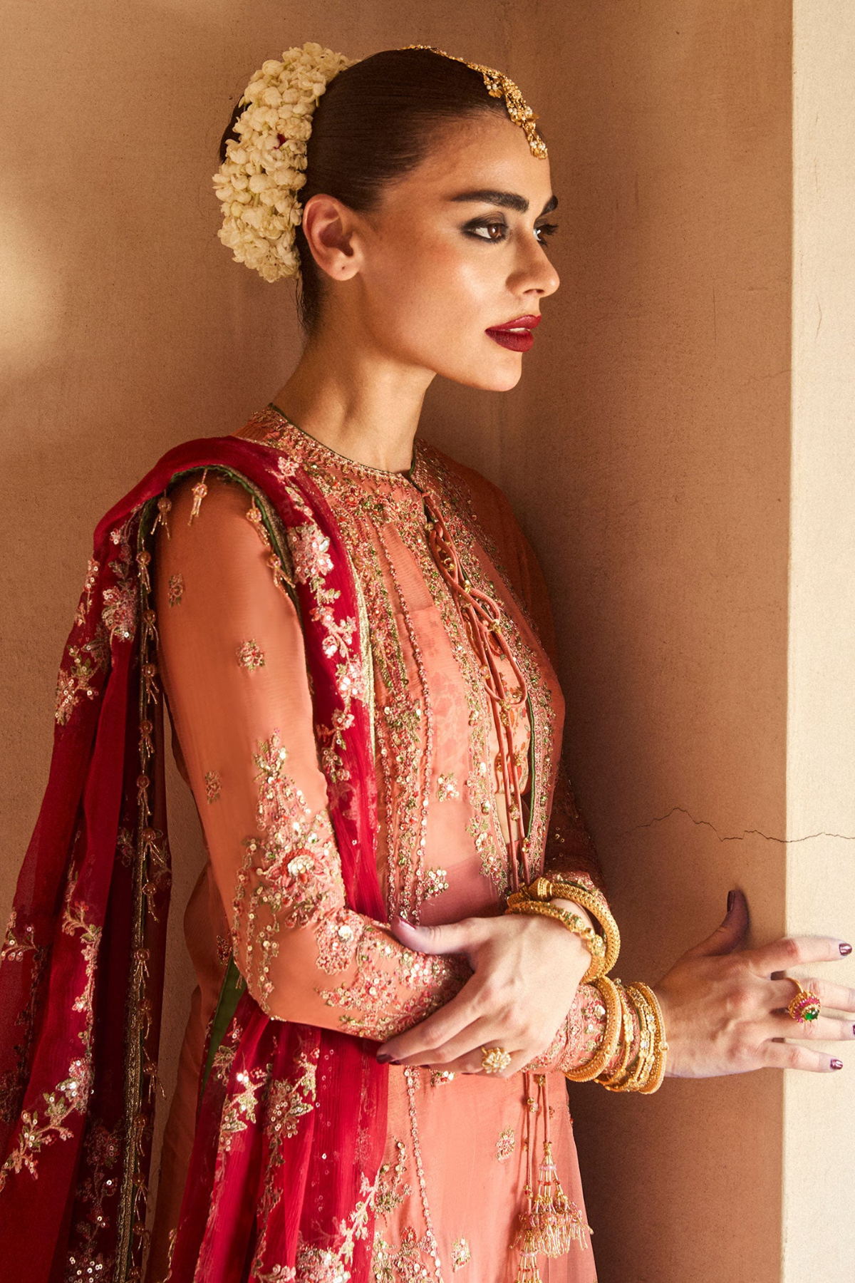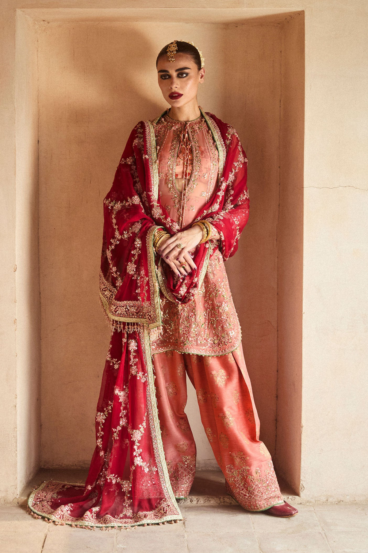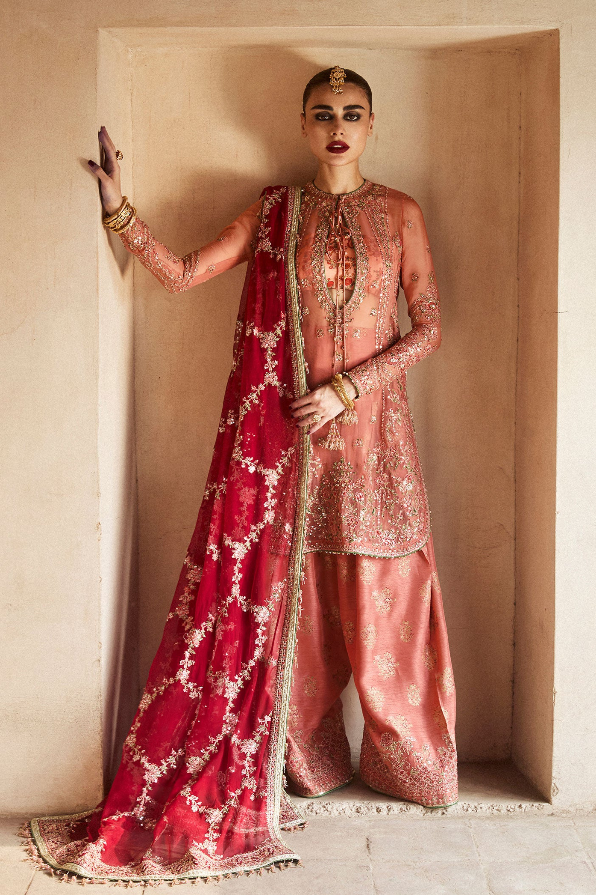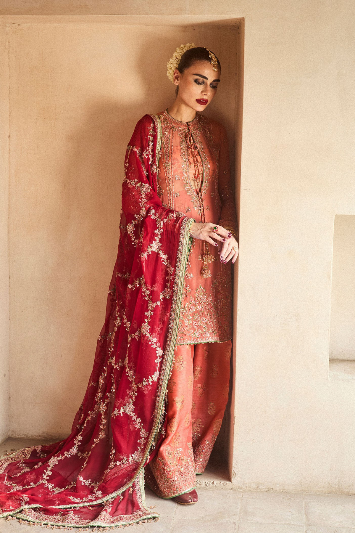 The look is completed with an intricately embroidered chiffon dupatta, featuring a unique jaal design and four-sided borders for a refined finish. This attire is the perfect fusion of sophistication and cultural aesthetics.