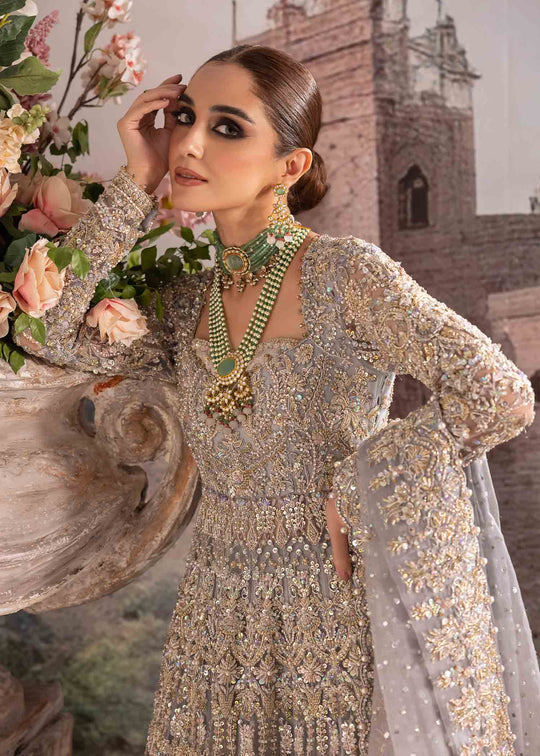 The intricately designed couture piece creates a graceful silhouette for the bride, embodying sophistication and contemporary allure. Paired with a luxurious Raw Silk Lehanga, the ensemble adds a touch of opulence, ensuring the bride's presence is nothing short of magnificent.