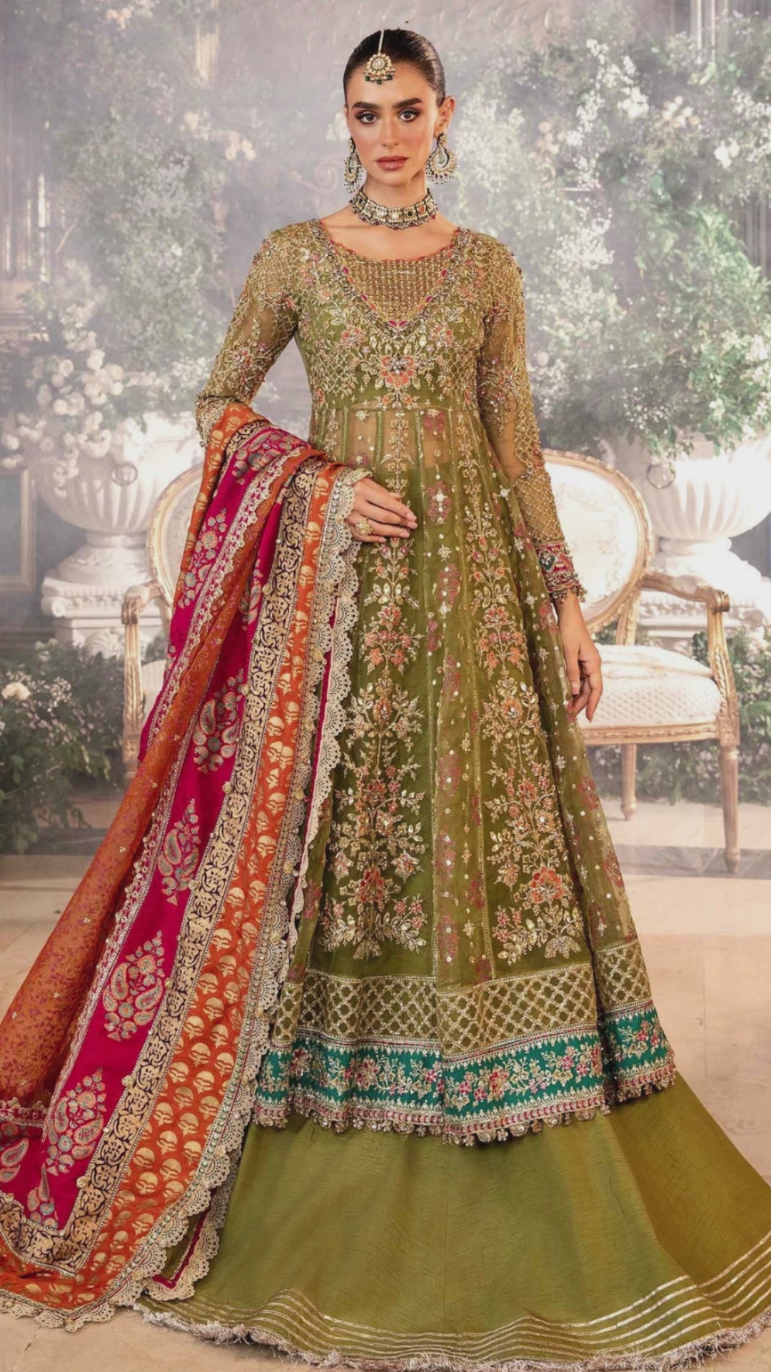 Step into the world of luxury with the enchanting Enchanted Green bridal ensemble. This stunning outfit is designed with a rich Organza shirt and a beautifully detailed Dyed Trouser, adorned with intricate embroidery and shimmering embellishments. The Organza dupatta completes the look, making it perfect for weddings, receptions, and festive occasions.