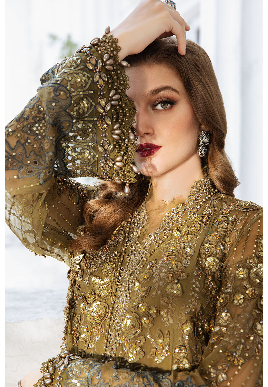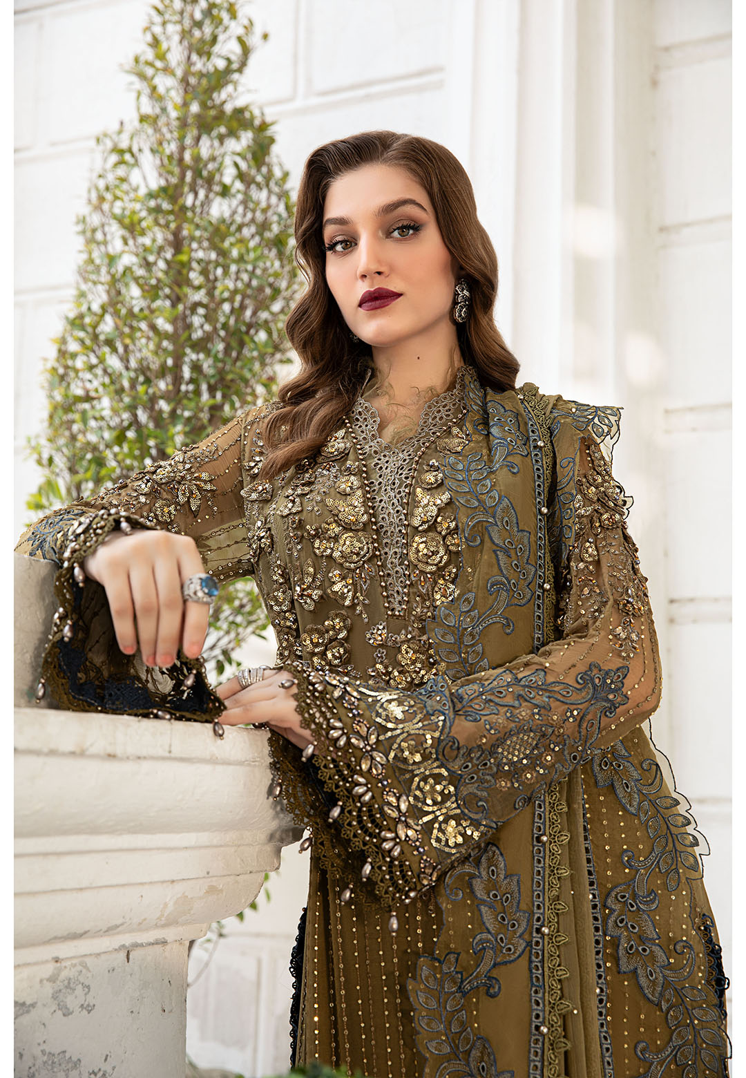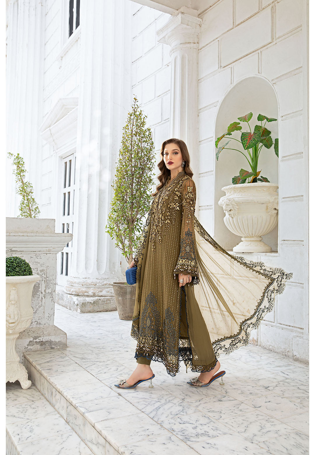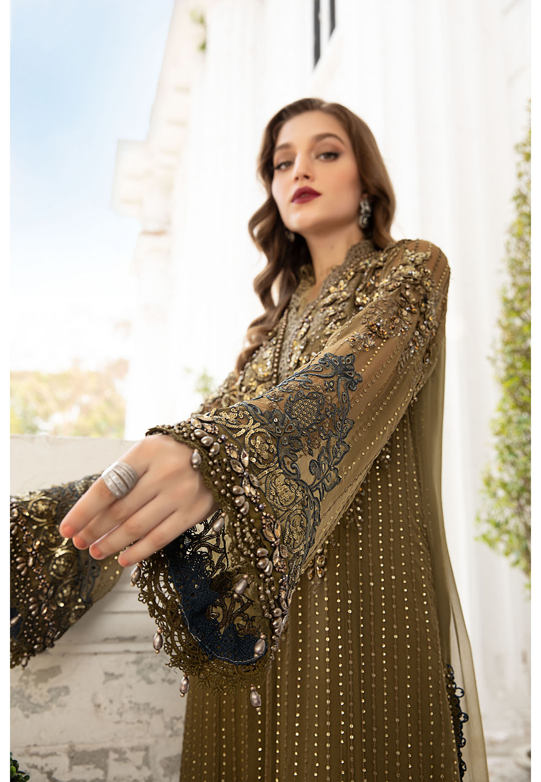 Exude timeless elegance with this olive green formal attire, designed for those who appreciate luxury and sophistication. The intricate embroidery and beadwork elevate the outfit, making it an exquisite choice for special occasions. Paired with a matching dupatta, this ensemble is both elegant and versatile, perfect for weddings, evening events, or festive gatherings. The unique olive hue adds a contemporary touch to a classic silhouette, ensuring that all eyes are on you.