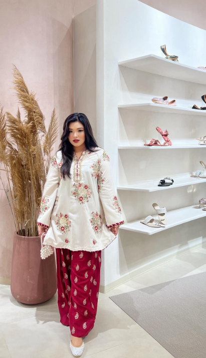 Where timeless tradition meets modern femininity — Ivoury is crafted in soft ivory lawn, kissed with rose-toned embroidery and paired with a bold maroon shalwar for a striking contrast.