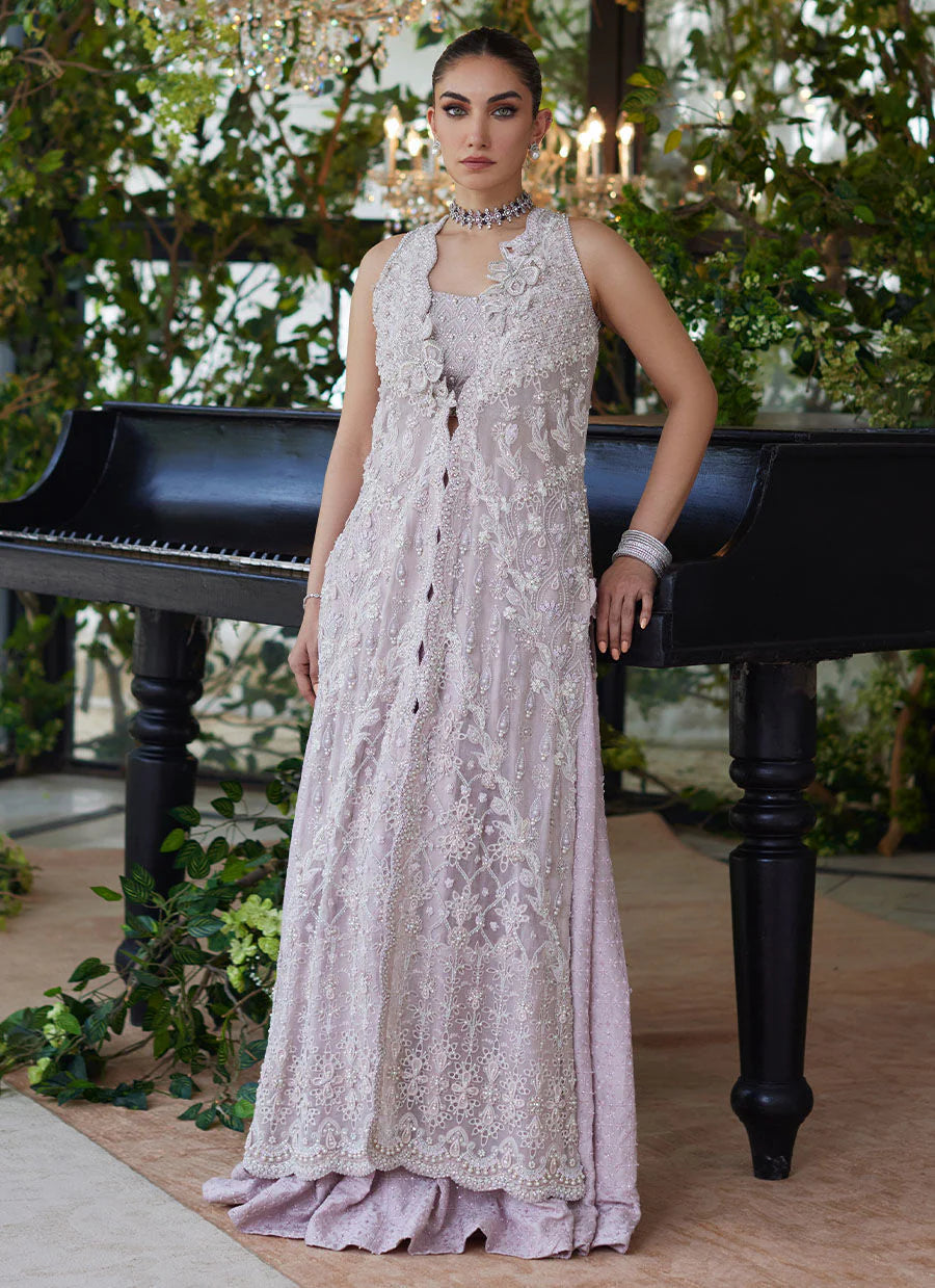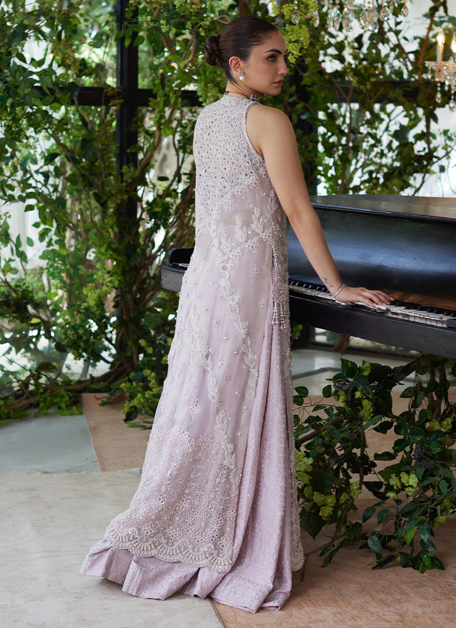 An exquisite dusty pink outfit featuring a flowy organza gown paired with elegant silk trousers. The gown is beautifully adorned with intricate silver embellishments, adding a touch of sparkle and sophistication. The soft hue of dusty pink combined with the shimmering silver work creates a perfect balance of grace and glamour — ideal for festive occasions, weddings, or formal events.