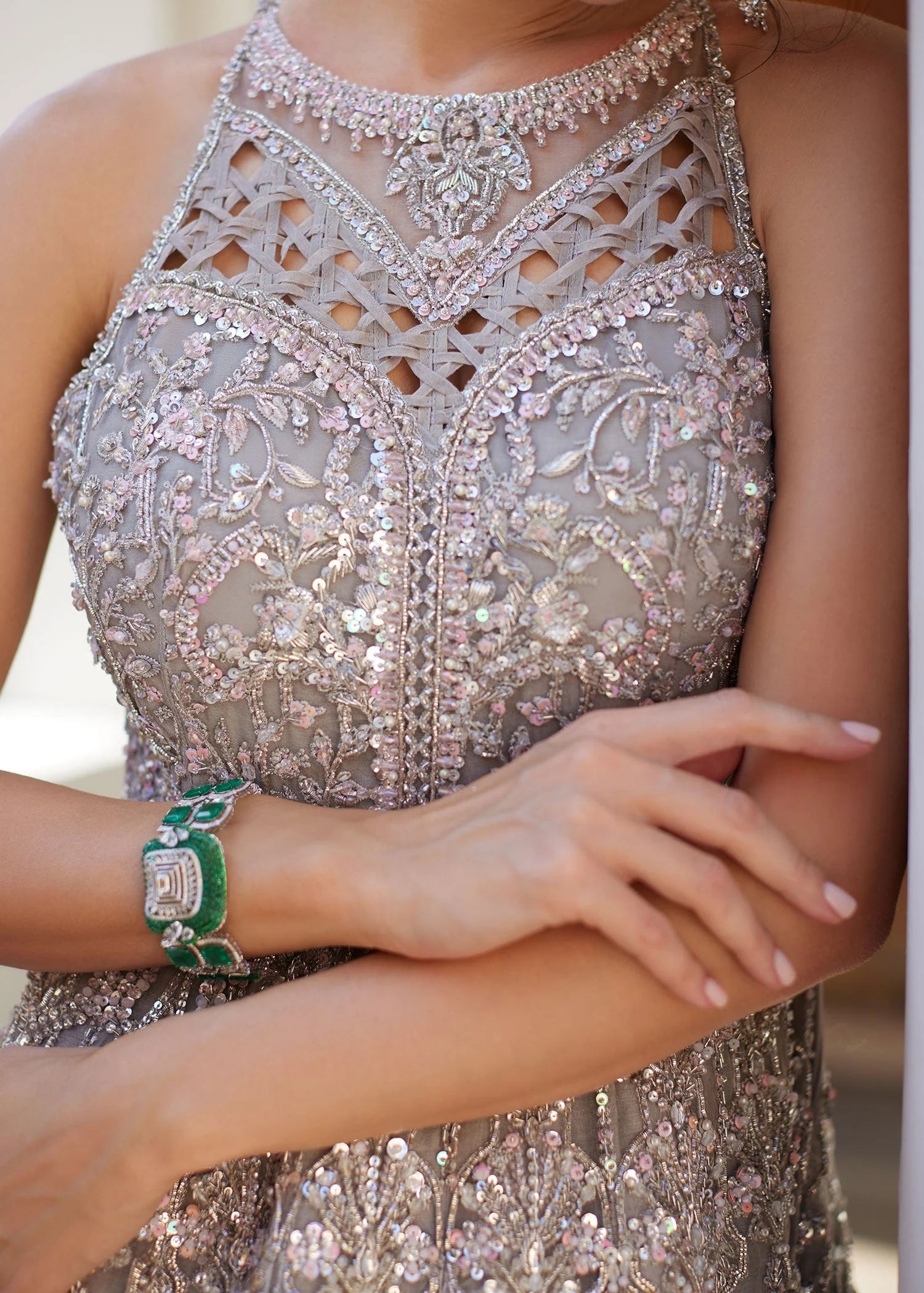 A stunning blend of contemporary sophistication and intricate craftsmanship. This breathtaking grey organza bridal gown features a chic halter neck, creating a structured, graceful silhouette that exudes timeless elegance. The exquisite check design stitching along the neckline adds texture and depth, highlighting the bride's shoulders with delicate precision. The gown’s dramatic flare is composed of voluminous layers of ethereal organza, cascading in soft, airy waves for a romantic, ethereal effect. Silver embellishments on the bodice shimmer with every step, elevating the gown's refined beauty. Paired with a matching embellished dupatta, adorned with intricate silver detailing, Ravina offers a cohesive and opulent bridal look, designed to make an unforgettable statement on your special day.
