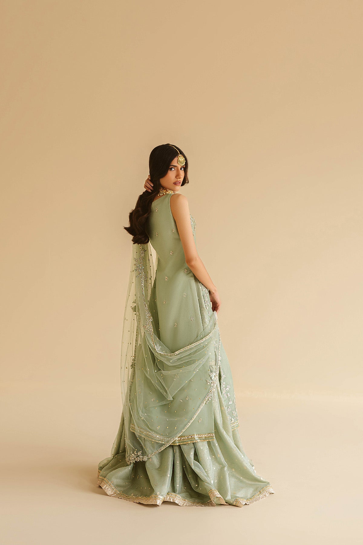 Introducing Celeste by Prince Fancy Clothing Store – a serene sea-green formal ensemble crafted to perfection. This gharara set, paired with a delicately embroidered long shirt and matching dupatta, blends traditional artistry with a contemporary silhouette. The intricate silver and golden handwork adds a luxurious touch, while the soft, flowing fabric ensures both elegance and comfort. Perfect for weddings, festive gatherings, and formal celebrations, Celeste is designed to bring out a graceful aura that leaves a lasting impression.
